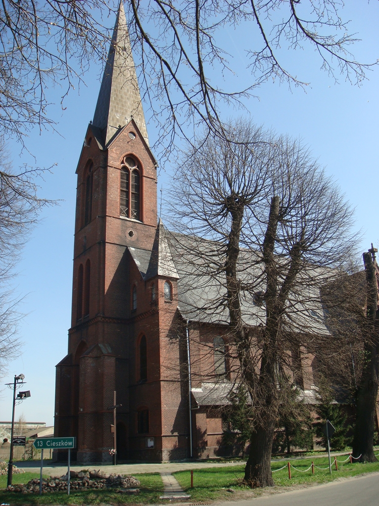 Obecnie istniejącą tu świątynię w 1890 roku zbudowali ewangelicy. Katolicy przejęli ją we wrześniu 1945 roku. Prostokątna podstawa budowli powiększona jest o transept. Po obu stronach kościoła dostawione są również niewielkie wieże. Wielobocznie zamknięta absyda wsparta jest szkarpami. W fasadzie świątyni znajduje się wysoka wieża nakryta spiczastym hełmem. Po obu jej stronach, w narożnikach, umieszczono wieżyczki. Otwory okienne zakończone są ostrołukowo. Nad portalami znajdują się również rozety. Świątynia nakryta jest dachami dwuspadowymi, pokrytymi łupkiem. W drugiej połowie XX wieku kościół był remontowany. obecnie trwa wymiana pokrycia dachu.