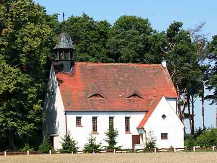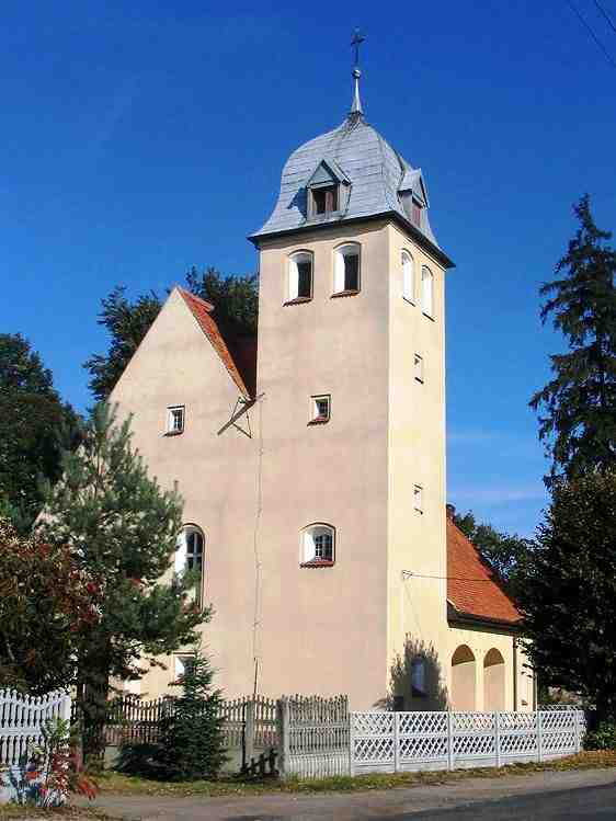 Prostokątna nawa powiększona jest o półkoliście zamkniętą absydę oraz kruchtę połączoną z wieżą. Wysoką konstrukcję wieńczy hełm z kulą i krzyżem. Nawę nakrywa dach dwuspadowy. Wnętrze oświetlają pełnołukowe oraz niewielkie prostokątne okna. Drzwi wejściowe umieszczone są we wnękach zamkniętych łukami odcinkowymi.